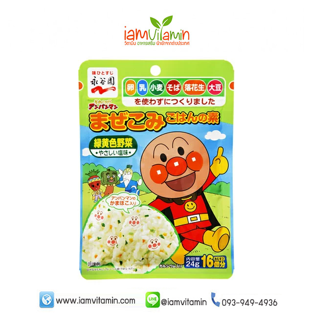 Go for it! Anpanman Mazekomi rice is a mixed green rice that does not contain “eggs, milk, wheat, buckwheat, peanuts, and soybeans.”