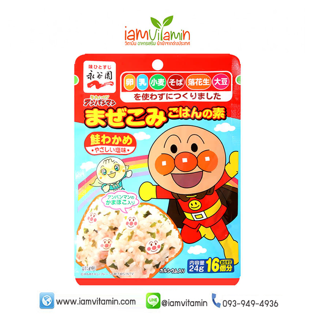 ผงโรยข้าว อันปังแมน จากญี่ปุ่น รสปลาแซลมอน สาหร่ายวาคาเมะ Anpanman Mazekomi Rice No Salmon 24g สำหรับเด็กหรือที่แพ้อาหารง่าย เป็นผงโรยผสมที่ไม่ได้ใช้ “ไข่, นม, ข้าวสาลี, วีท, ถั่วลิสง, ถั่วเหลือง” ใช้จากสาหร่ายและปลาแซลมอน และมีรสชาติที่อ่อนโยน (รสเค็มเล็กน้อย) มีแคลเซียมซึ่งเป็นสิ่งที่ดีสำหรับการเจริญเติบโตของเด็ก