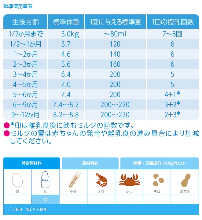 Nutrition information (per 100g) Energy 514kcal ・ Vitamin B2 0.8mg ・ Niacin 5.0mg ・ Potassium 500mg ・ Protein 11.1g ・ Vitamin B6 0.4mg ・ Pantothenic acid 4.0mg ・ Magnesium 37mg ・ Fat 27.8g ・ Vitamin B12 1.5μg ・ Folic acid 100μg・ Copper 0.31mg ・ Carbohydrate 56.1g ・ Vitamin C 60mg ・ Biotin 15μg ・ Zinc 3.0mg ・ Salt equivalent 0.38g ・ Vitamin D 9.3μg ・ Calcium 350mg ・ Selenium 7.5μg ・ Vitamin A 450μg ・ Vitamin E4.5mg ・ Phosphorus 200mg ・Vitamin B1 0.4mg, vitamin K 26μg, iron 6.2mg, osteopontin 40mg, α-linolenic acid 0.65g, ribonucleic acid (RNA) 10-30mg, β-carotene 40μg, cystine 190mg, docosahexaenoic acid (DHA) 70mg, galactosyl lactose 2.5g・ 310mg of chlorine ・ 26mg of taurine ・ 230mg of phospholipid ・ 165mg of sialic acid ・ 2.2g of ash ・ 15mg of carnitine ・ 70mg of sphingomyelin ・ 65mg of choline ・ 2.8g of water ・ 5.2 g of oleic acid, 16 mg of nucleotides, 60 mg of inositol, main mixture Milk components other than milk or dairy products (lactose, casein, whey protein) 24,9% Fat other than milk fat (palm kernel oil, soybean oil, palm oil)・ Canola oil ・ Refined fish oil) 26.5%