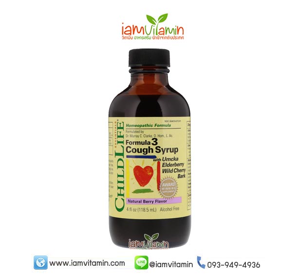 ChildLife Essentials Formula 3 Cough Syrup แก้ไอ สมุนไพรบรรเทาอาการไอสำหรับเด็ก นำเอาสุดยอดสมุนไพร 3 ชนิด ได้แก่ Elderberry, Umckaloabo และ Cherry Bark ช่วยบรรเทาอาการไอของลูกน้อยอย่างปลอดภัยและมีประสิทธิภาพ ทั้งอาการไอแห้ง ไอมีเสมหะ ไอเรื้อรัง และอาการไอทุกรูปแบบ และยังมีส่วนผสมของ Buckwheat Honey น้ำผึ้งแท้จากธรรมชาติที่สามารถช่วยให้หายจากอาการไอจากหวัดได้รวดเร็วยิ่งขึ้น ลูกน้อยจึงนอนหลับพักผ่อนได้ยาวนาน ฟื้นตัวได้ดี หายป่วยได้เร็วกว่า ไม่ต้องหยุดเรียนนานหลายวัน และยังรับประทานง่ายด้วยรสเบอร์รี่ธรรมชาติแสนอร่อยค่ะ