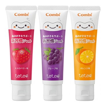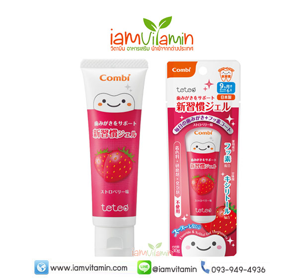 Combi teteo Gel Dentifrice Fluoride & Xylitol Strawberry เจลสีฟัน ยาสีฟันเจล สตรอว์เบอร์รี่ ยาสีฟันเด็กกลืนได้ 30 กรัม มีส่วนผสมของ Xylintol และฟลูออไรด์ ในปริมาณที่พอเหมาะ จึงมีประสิทธิภาพในการป้องกันฟันผุและรักษาสุขภาพเหงือกสำหรับเด็กเล็กได้อย่างดีเยี่ยม นอกจากนี้ส่วนผสมของ Anhydroussalicic acid ที่ช่วยให้ฟันขาวสะอาด ไม่มีส่วนผสมของสารที่ทำให้เกิดฟอง ไม่มีสี ไม่เผ็ด มีแต่กลิ่นหอมอ่อนๆ ที่ทำให้รู้สึกสะอาด สดชื่น ไม่เป็นอันตรายแม้ลูกน้อยกลืนยาสีฟัน