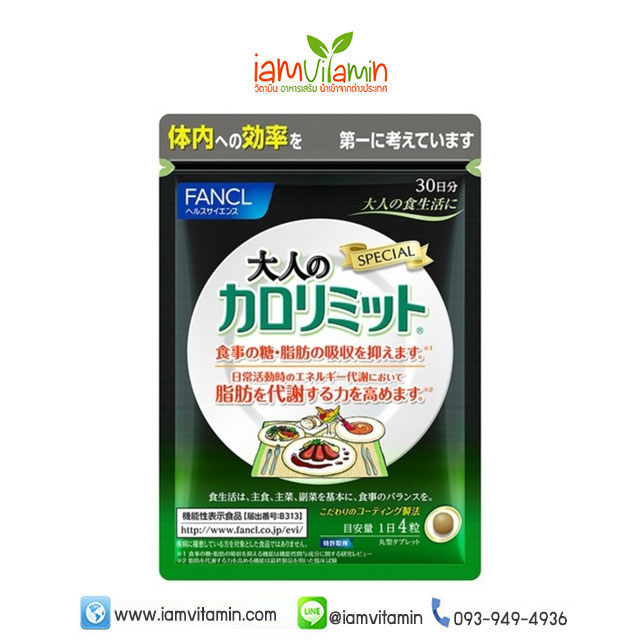 FANCL Calorie Limit Special Adult ฟังเคล แคลอรี่ ลิมิต อาหารเสริมควบคุมน้ำหนัก ประเภทดักจับไขมัน แป้ง น้ำตาล สำหรับผู้ใหญ่ อายุ 35 ปีขึ้นไป ชนิดเม็ด 30 วัน จุดเด่น:ป้องกันการเกิดไขมันสะสม ช่วยลดไตรกลีเซอไรด์และคอเลสเตอรอล ถ้าคุณชอบทานอาหารที่มีไขมันสูง อดใจไม่ไหวจริงๆๆ ที่ต้องทาน ขนม นมเนย เค้ก ของหวาน ประกอบด้วยสารสกัดจากชาเขียวเข้มข้น มีคุณภาพสูง ช่วยกระตุ้นระบบการเผาผลาญไขมันส่วนเกินมีผลต่อการช่วยเพิ่มเมตาบอลิซึม การเผาผลาญพลังงานและไขมันได้ อาหารเสริมควบคุมน้ำหนัก fancl calorie limit adult สำหรับผู้ใหญ่ที่กังวลเรื่องน้ำหนัก เมื่อมีอายุมากขึ้นระบบการเผาผลาญเริ่มทำงานได้น้อยลง และทานอาหารจำพวกแป้งและน้าตาล อาหารหนักเช่นเนื้อสัตว์ จึงทำให้เกิดภาวะอ้วน ไขมันสะสม หุ่นจึงเริ่มเปลี่ยนไปเป็นหนาขึ้น