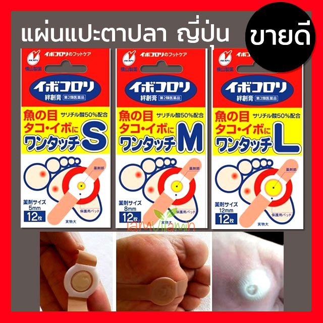 Ibokorori One Touch Size L แผ่นแปะตาปลาญี่ปุ่น บรรจุ 12 ชิ้น พลาสเตอร์ของ Yokoyama Seiyaku นั้นมีเอกลักษณ์เฉพาะตัว และรุ่น ibokorori (อิโบโคโรริ) ก็มีพลาสเตอร์หลายขนาด สามารถเลือกใช้ได้ตามขนาดแผล คำว่า ibo (イボ ) นั้นแปลว่า หูด ส่วนคำว่า korori (コロリ) แปลว่า ง่ายดาย เพราะฉะนั้นเราจึงสามารถใช้พลาสเตอร์ ibokorori ในการรักษาหูดได้อย่างง่ายๆเลย