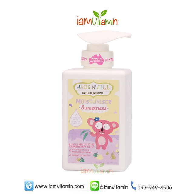 Jack N’ Jill Natural Bathtime Moisturizer Sweetness 300ml ครีมทาผิวเด็ก มอยส์เจอไรเซอร์ จากธรรมชาติ ปลอบประโลมผิวของเจ้าตัวน้อยด้วย สูตรพิเศษสำหรับผิวบอบบางแพ้ง่ายนี้อุดมไปด้วยน้ำมันมะพร้าวออร์แกนิกน้ำมัน Palmarosa และสารสกัดจากไข่มุกออสเตรเลียพื้นเมืองต่อต้านการอักเสบเพื่อช่วยให้ผิวของคุณสงบลงในขณะที่ยังคงความนุ่มและชุ่มชื้นเป็นพิเศษ