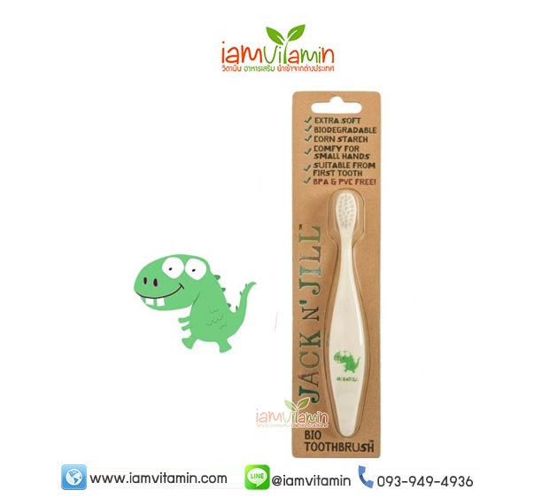 แปรงสีฟัน Jack n’ Jill Dino Toothbrush ที่สามารถย่อยสลายได้ตามธรรมชาติ เป็นมิตรต่อสิ่งแวดล้อม หัวแปรงไนลอนกลมและนุ่มเพื่อการทำความสะอาดอย่างล้ำลึก ขนแปรงนิ่มทำจากไนลอนทรงกลมเพื่อการแปรงฟันที่มีประสิทธิภาพ และด้ามจับออกแบบตามหลักสรีรศาตร์ ทำจากแป้งข้าวโพด100% หรือ Corn Starch 100%