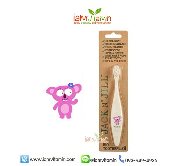 แปรงสีฟัน Jack n’ Jill Koala Toothbrush ที่สามารถย่อยสลายได้ตามธรรมชาติ เป็นมิตรต่อสิ่งแวดล้อม หัวแปรงไนลอนกลมและนุ่มเพื่อการทำความสะอาดอย่างล้ำลึก ขนแปรงนิ่มทำจากไนลอนทรงกลมเพื่อการแปรงฟันที่มีประสิทธิภาพ และด้ามจับออกแบบตามหลักสรีรศาตร์ ทำจากแป้งข้าวโพด100% หรือ Corn Starch 100%