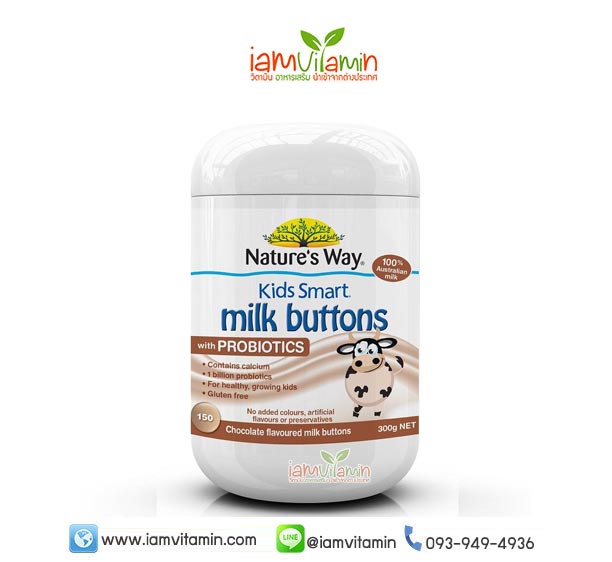 Nature’s Way Kids Milk Buttons + PROBIOTICS เนเจอร์สเวย์ คิดส์ มิ้ลบัททันส์ บรรจุ 150เม็ด จะดีแค่ไหนถ้าเราทำให้การรับประทานนมน่าตื่นเต้นขึ้น? เราคัดสรรนมคุณภาพจากวัวที่เลี้ยงในทุ่งหญ้าประเทศออสเตรเลีย และเติมคุณประโยชน์ของ PROBIOTICS ลงไปถึง 1 พันล้าน CFU !! ซึ่งเป็นฮีโร่แบคทีเรียตัวดีที่จะไปช่วยสมดุลการทำงานของลำไส้ คุณประโยชน์มาพร้อมทั้งกับความหอมของชอคโกแลต อร่อยเพลิน ทั้งกระดูกฟันแข็งแรงจากแคลเซียม ระบบทางเดินอาหารดีอีกด้วย