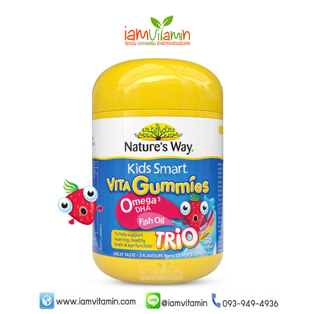 Nature’s Way Kids Smart Vita Gummies Omega 3 DHA Fish Oil Trio 60 เม็ด น้ำมันปลา DHA เป็นวิธีที่ดีในการเสริมการบริโภคของ Omega-3 สามารถรองรับการเจริญเติบโตและพัฒนาการของลูกของคุณ นอกจากนี้ยังสามารถช่วยสนับสนุนสุขภาพทั่วไปและความเป็นอยู่ที่ดีของบุตรหลานของคุณและให้การสนับสนุนด้านสุขภาพตาและสมอง รสชาติอร่อย ไม่มีกลิ่นคาวปลา มี 3 รสชาติคือ เบอร์รี่ เลม่อน และส้ม