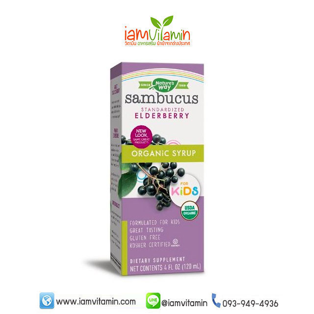 Nature’s Way Sambucus Organic Kids Elderberry Syrup 120ml ป้องกันหวัด เสริมภูมิคุ้มกัน สำหรับเด็ก รสชาดอร่อย ช่วยแก้หวัด คัดจมูก จิบเพื่อช่วยแก้เจ็บคอในเด็กคะ อากาศเปลี่ยนจิบเพื่อป้องกันหวัดไว้เลยคะ ให้รสหวานธรรมชาติ เสริมภูมิคุ้มกัน