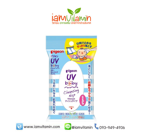Pigeon UV Baby Cleansing Nap ผ้าเช็ดครีมกันแดด ใช้เช็ดทำความสะอาดครีมกันแดดได้อย่างหมดจด หรือใช้เช็ดก่อนทาครีมกันแดดซ้ำ มีส่วนผสมของของสารสกัดจากว่านหางจระเข้ (ALOE VERA) เพิ่มความชุ่มชื้น อ่อนโยนต่อผิว พร้อมป้องกันผิวเสียหลังจากถูกแสงแดด