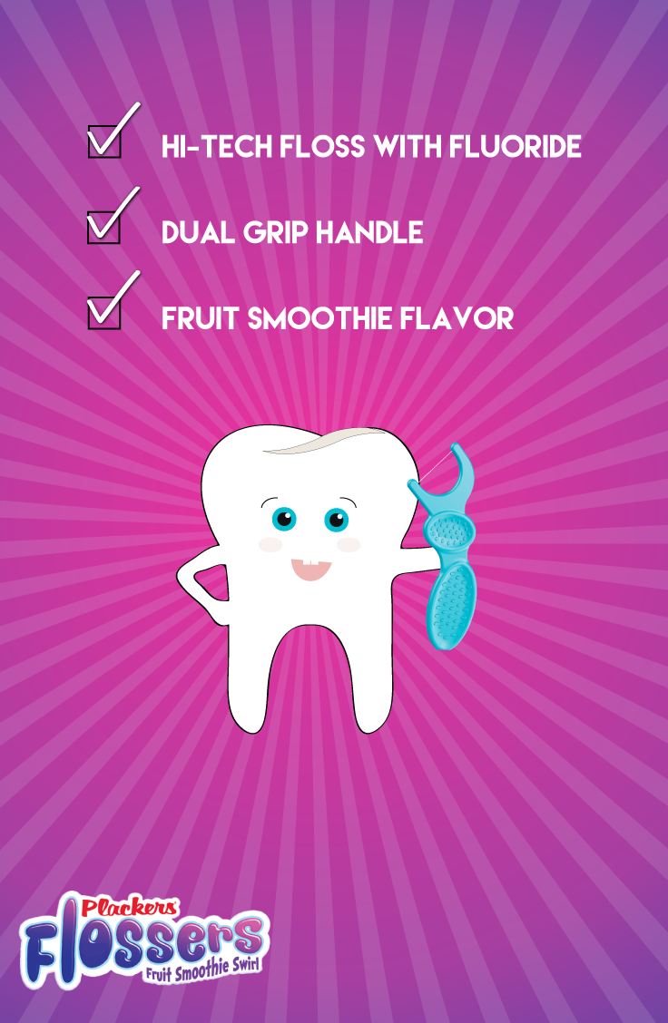 - Fruit Smoothie Swirl flavor and colored flossers that make flossing fun for kids
