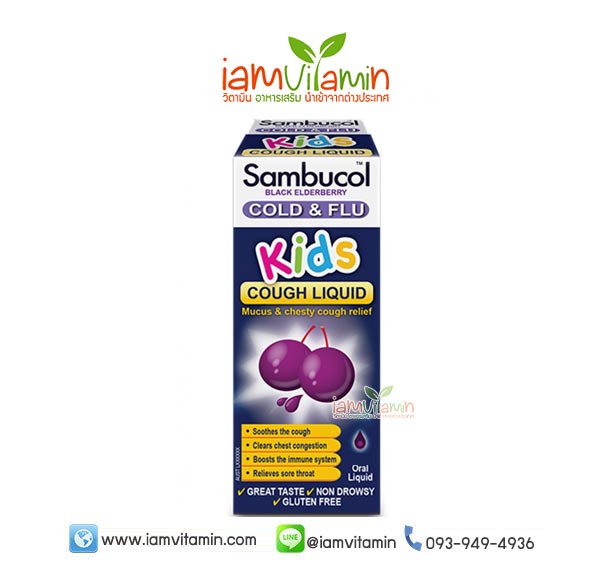 Sambucol Cold & Flu Kids Cough Liquid 120ml วิตามินเสริมภูมิคุ้ม ต้านอาการไข้หวัด สำหรับเด็ก อันอุดมไปด้วย Flavonoid BioActives ที่มีประสิทธิภาพสูง สร้างสารต้านอนุมูลอิสระจากธรรมชาติสูงกว่าวิตามิน C และวิตามิน E ถึง 50 เท่า