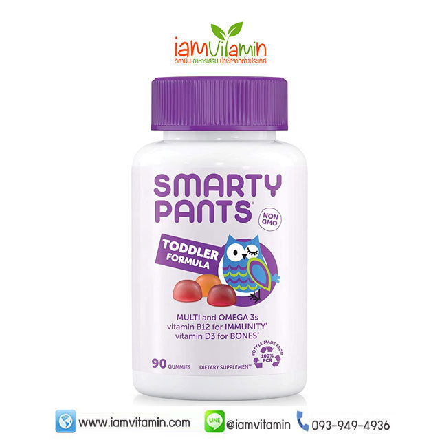SmartyPants Toddler Formula Multivitamin 90 Gummies สารอาหารที่จำเป็น 15 ชนิด: วิตามิน D3 สำหรับกระดูก, วิตามินบี 12 (เมทิลโคบาลามิน) สำหรับภูมิคุ้มกัน, โอเมก้า 3 EPA และ DHA (จากน้ำมันปลา), วิตามินอี (จากน้ำมันดอกทานตะวัน) สำหรับการต้านอนุมูลอิสระและไอโอดีนสำหรับสนับสนุนต่อมไทรอยด์ *